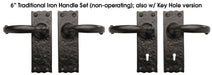 The 6" Traditional Handle Set is a non-operating decorative hardware accessory crafted from durable iron. Designed for gates, doors, or decorative panels, each pair features a solid base measuring 6 1/4" x 2" and handles with a 4 1/2" overall width. With an elevation of 2 1/4", this handle set provides a bold and functional accent to your space. Available in various finishes, including options with keyhole integration, it offers both classic style and versatility.